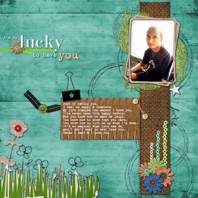 I submitted a layout for a challenge over Traci Reed's Hawt Mama team blog and won a $10 GC to her store! I'm so excited!! And it's a layout of my boyfriend too, hehe. The challenge is to use at least 3 geometrical shapes in a layout. Here's the layout that won me the $10 GC - it's the one that I use everything from Oscraps' Lucky O collab kit: